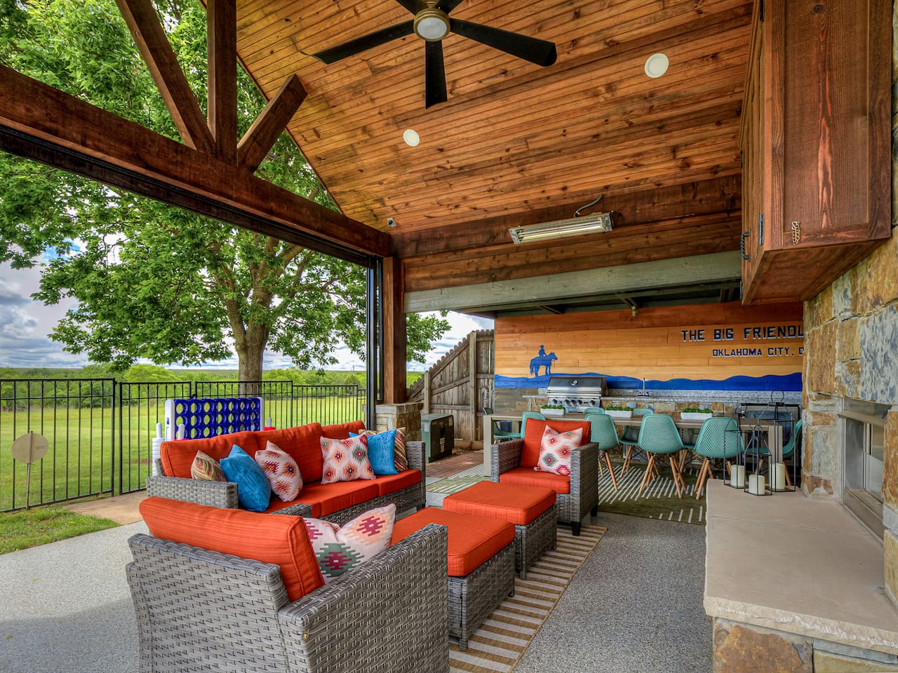 This amazing home provides: 3 Bedrooms Office 5 Bathrooms Game Room Bedroom 1 (King) Cal King bed Lounge Chairs TV Bedroom 2 (Double Queen) Two Queen beds Benches TV Bedroom 3 (Bunks) Two Queen Bunkbeds Pullout Full Trundle bed Kids chair & games TV Office Pullout Full Memory Foam bed Computer Desk Bathrooms: Primary Bathroom Heated floors Jacuzzi Tub Double Shower Double vanity Bathroom 2 Jack & Jill for BRs 2 and 3 Full shower / bath Double vanity Bathroom 3 (pool) Full bath w/ walk-in shower Bathroom 4 Half bath off indoor Bar Bathroom 5 Half bath off Kitchen / Game Room Game Room Cowboy theme with custom flooring and decor Mini Split unit for dedicated temperature control 75" TV and couch for watching the big games Pool / Ping Pong table / Poker table (w/ cards and chips) Foosball coffee table Two Arcade consoles with 50+ games Darts Wall Art Games (Tic-tac-toe, Checkers, Chess, Backgammon) Outdoor Space Built-in gas grill Sink Wine & Food Fridges Remote sun / bug shade Remote 8' fan Remote, built in heaters Outdoor dinning table Lounge setup with couch and chairs around fit pit and TV 12-person hot tub with built-in bluetooth Yard games (mini disc golf, corn hole, giant Jenga, giant Connect 4) In-ground pool with floaties Indoor Wet Bar Wine Fridge Mini Fridge Sink LED Bar Shelves Bartending Kit with Cocktail Glasses Heating / Cooling: New Nest Pro thermostats Dual Zones Fully recharged A/C system in July '25 Highlights: 1. NEWLY RENOVATED SPACIOUS DESIGN: Step inside to discover a spacious and inviting layout with TONS of natural light. The perfect gathering place for family and friends, the living area seamlessly flows into the dining and kitchen areas, making it easy to enjoy each other's company. 2. SEE FOR MILES: This amazing property backs up to open space which is usable by tenants. Because of this, it feels like you are living in a wilderness retreat, with deer coming up to the back fence morning and night. You have an unobstructed view for literally miles from the back yard and outdoor amenities. Soak in the hot tub or enjoy a drink by the pool surrounded by nature. 2. FULLY STOCKED KITCHEN: Our kitchen provides all the amenities for breakfast, lunch or dinner. It features modern appliances, allowing you to prepare delicious meals with ease. Whether you're cooking up a hearty breakfast before heading out to enjoy the the lake or whipping up a gourmet dinner to enjoy the open space in the back, this kitchen has you covered. 3. OUTDOOR AMENITIES: One of the standout features of our property is the back yard. It's the ultimate entertainment hub, perfect for friendly competitions and relaxing after a day of adventures. The Big Friendly offers an array of activities to enhance your stay. Relax in pool or hut tub, or challenge friends and family with games like Giant Jenga and Connect 4, Corn Hole and mini Disc golf. 4. ULTIMATE RELAXATION & ENTERTAINMENT: We've gone above and beyond to make your stay truly exceptional. Between the pool, outdoor kitchen and dedicated game room, our property features top-of-the-line amenities. 5. PRIME LOCATION: Nestled in a quite family neighborhood, The Big Friendly offers tranquility and privacy while providing easy access to an array of local attractions, including eclectic shops, renowned restaurants, and lively entertainment venues. Just a short drive from downtown OKC, beautiful lakes, hiking, and major highways, you'll find it convenient to explore everything the area has to offer. Whether you're here for a weekend getaway or an extended stay, our home provides the perfect base for experiencing the best of OKC and beyond. Whether you're planning a family trip, a reunion with friends, or a getaway to relax and unwind, The Big Friendly is the ideal retreat. Book your stay with us today and experience the perfect blend of historic charm and modern luxury in the heart of OKC.